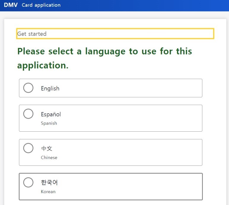 운전면허/ID card 신청을 클릭하시고 다음 화면에서 ‘start application’ 이라는 파란 버튼을 클릭하시면, ‘Please select a language to use for this application’ 에서 반가운 ‘한국어’ 항목이 보입니다. 캘리포니아 DMV 계정이 필요하니 회원가입하시고 계정만드신 후 신청단계에서 로그인 연동하시면 됩니다.